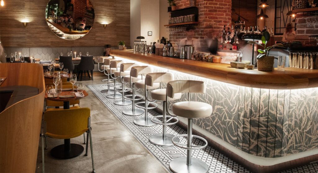 Bárpult, hátfal, korlát, válaszfal, lámpák